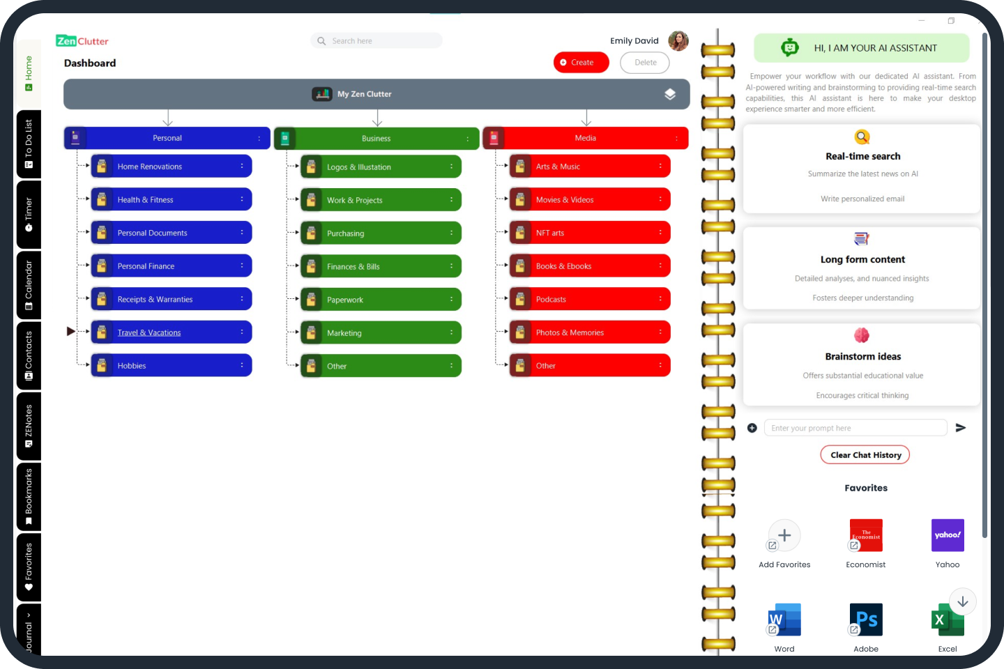Zen Clutter helps you organize and manage your computer folders your way. You’re your computer organized with categorized folders for easy access, like "Finances," "Work," or "Travel Plans."